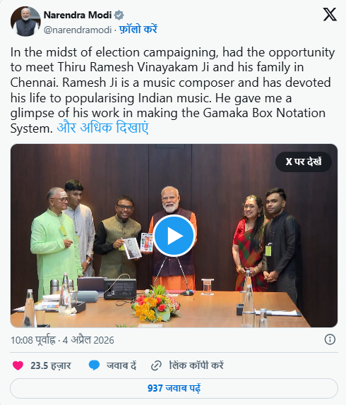 इस मुलाकात के दौरान रमेश विनायकम ने प्रधानमंत्री को अपने खास ‘गमक बॉक्स नोटेशन सिस्टम’ के बारे में बताया। यह एक ऐसी तकनीक है, जिससे भारतीय शास्त्रीय संगीत के जटिल सुरों और गमक को लिखित रूप में समझाया जा सकता है। पीएम मोदी ने इस इनोवेशन को भारतीय संगीत को वैश्विक पहचान दिलाने वाला कदम बताया।