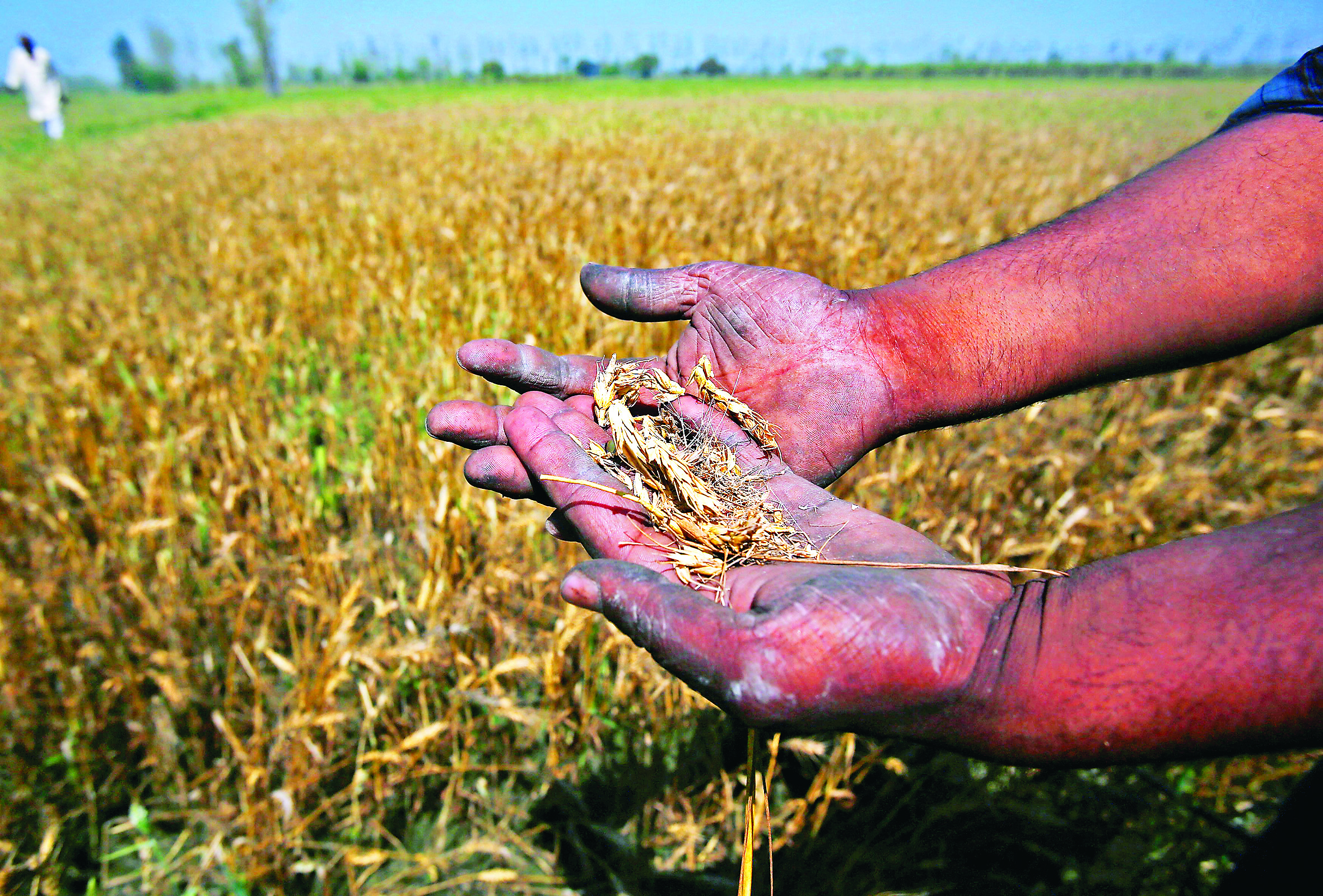 A farmer shows wheat crop damaged by unseasonal rains in his wheat field in Sisola Khurd