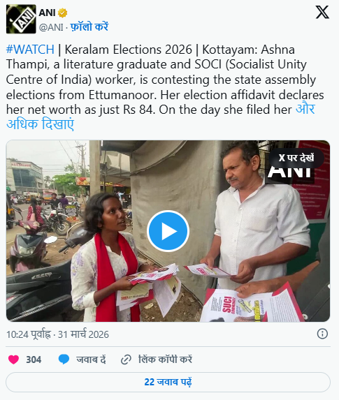 नई दिल्ली: Kerala के एट्टुमानूर विधानसभा सीट से चुनाव लड़ रहीं 26 साल की Ashna Thampi इन दिनों चर्चा का बड़ा विषय बनी हुई हैं। वजह है उनका चुनावी हलफनामा, जिसमें उन्होंने अपनी कुल संपत्ति सिर्फ 84 रुपये बताई है। इसमें 40 रुपये नकद और 44 रुपये बैंक खाते में दर्ज हैं।