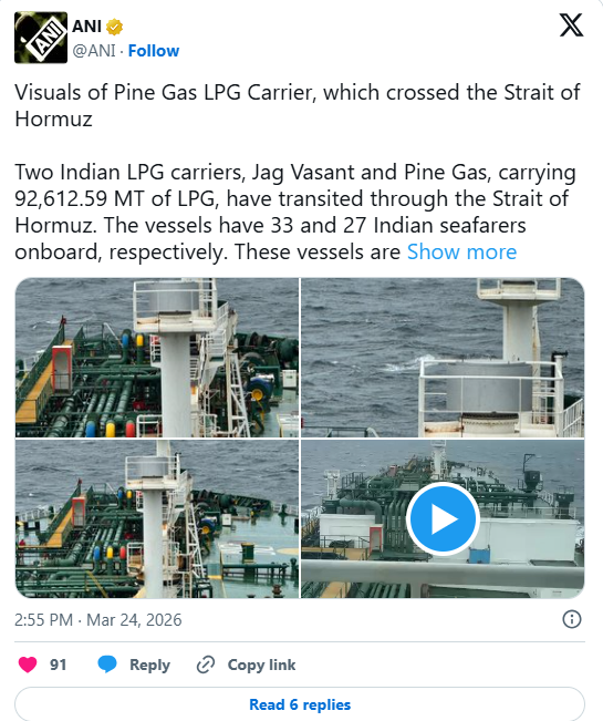 नई दिल्ली: पश्चिम एशिया में जारी तनाव के बीच भारत के लिए एक अच्छी खबर सामने आई है। देश के दो एलपीजी टैंकर Jag Vasant और Pine Gas सुरक्षित तरीके से Strait of Hormuz को पार कर चुके हैं और अब भारत की तरफ बढ़ रहे हैं। इन जहाजों पर करीब 92,600 मीट्रिक टन एलपीजी लदा हुआ है, जो देश की गैस सप्लाई के लिहाज से काफी अहम माना जा रहा है।