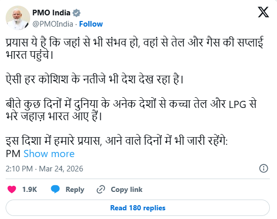 प्रधानमंत्री ने यह भी बताया कि भारत अपनी ऊर्जा जरूरतों के लिए कई देशों पर निर्भर है और ऐसे हालात में सरकार पूरी तरह सतर्क और सक्रिय है। उन्होंने भरोसा दिलाया कि देश में फिलहाल पेट्रोलियम और गैस की पर्याप्त उपलब्धता है और सप्लाई को बनाए रखने के लिए हर जरूरी कदम उठाए जा रहे हैं।